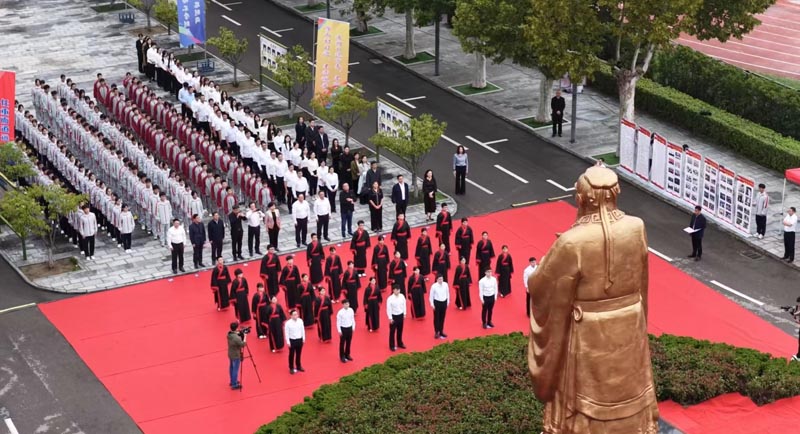 上午9時28分,典禮正式啟幕。在全體師生莊重的注目中,四位主禮嘉賓緩緩揭去覆蓋于圣像之上的紅色帷幕。一尊高7.2米、面容慈和、風范儒雅的孔子圣像巍然矗立于校園,其深邃的目光仿佛跨越千年時空,將智慧的光芒灑滿天一校園。在場師生自發整理衣冠,肅立致敬,向先師行注目禮,現場洋溢著對傳統文化與教育先哲的崇高敬意。