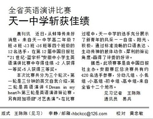 全省英語(yǔ)演講比賽淮北天一中學(xué)斬獲佳績(jī)