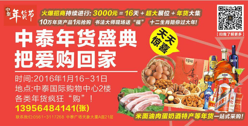 您好!誠摯邀請您和貴單位參加由淮北市人民政府支持,淮北市食品工業(yè)協(xié)會、淮北市代理商聯(lián)合會主辦,淮北天宇廣告有限責任公司承辦的“中泰國際·2016 中國(淮北)年貨展銷節(jié)”(簡稱:2016淮北中泰年貨節(jié))年文化主題盛會。2016中泰年貨節(jié)主題活動:第一大主題年俗,即中國傳統(tǒng)年文化為主題,比如:民俗手工藝(捏糖人、剪紙、繡花等)等;第二大主題年味,即年的味道,我們過年時所需要的吃喝玩樂購等商品,趕集、年貨一站式采購。